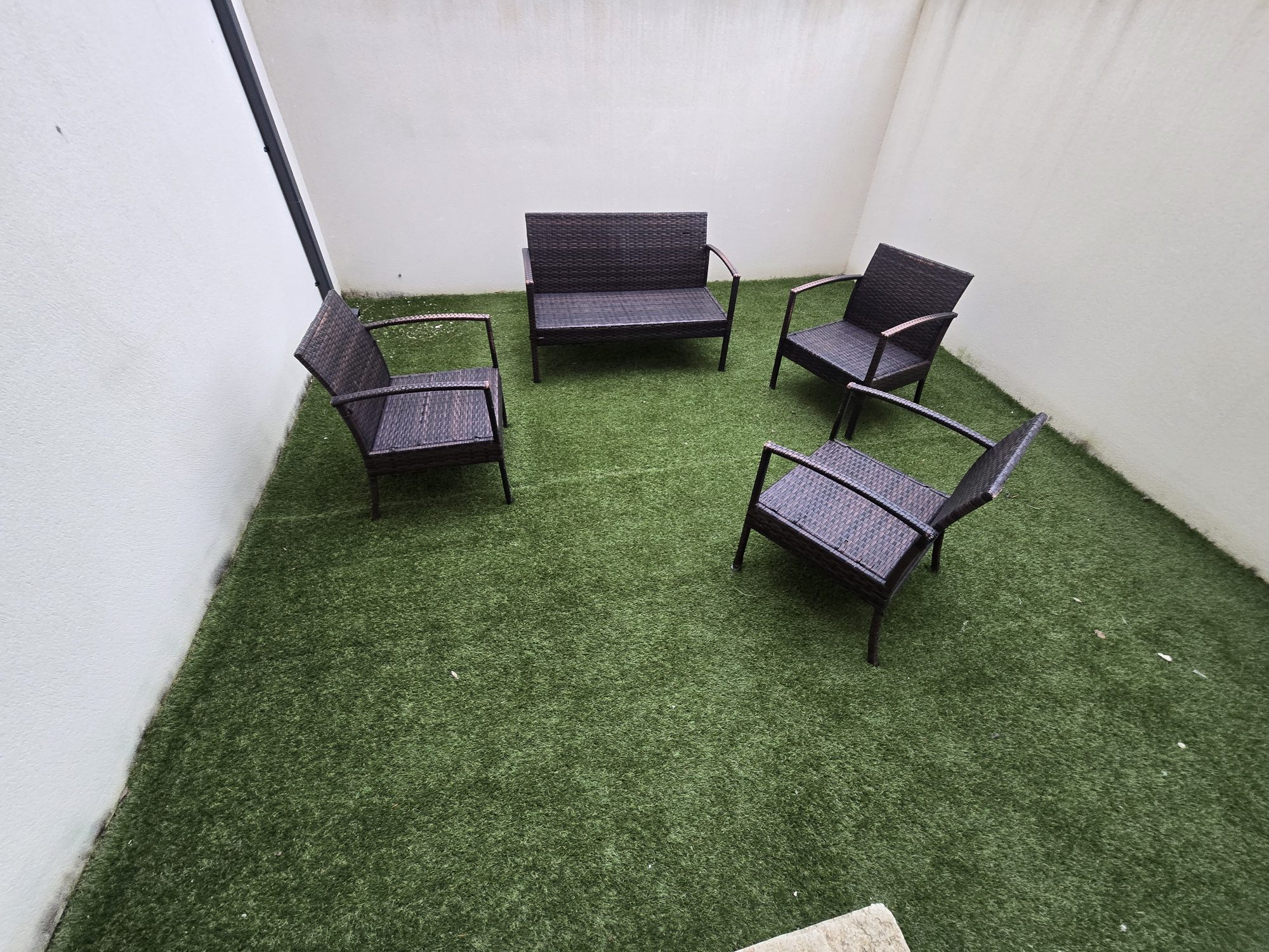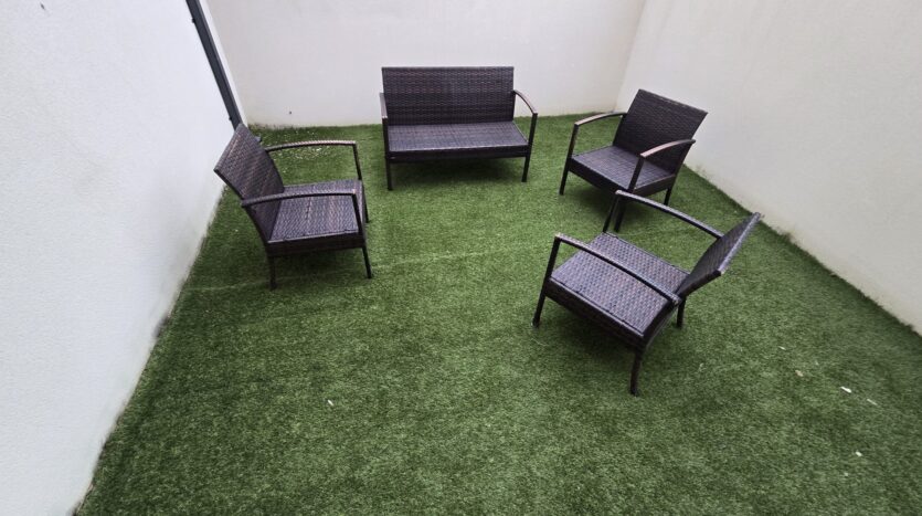 L’extérieur est tout aussi agréable avec une terrasse d’environ 58 m², et deux cours d’environ 15 m² chacune, idéales pour des dîners en plein air.